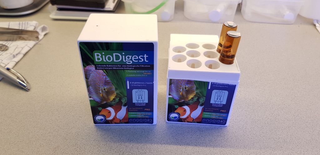 På cyanofronten er der klare fremskridt. Bagvæggen er suget helt fri for synlig cyano og der kom de fineste lyserøde kalkalger frem. Der er næsten intet tilbage på stensætningen og kun lidt på bundlaget. Det gav så et ekstra vandskift på 60L. Efter det var til side, kom jeg to ampuller af prodibio bakterier i. Nu var cyanoen jo bombet tilbage og der er masser af ledig plads prodibio bakterierne kan sætte sig fast på.