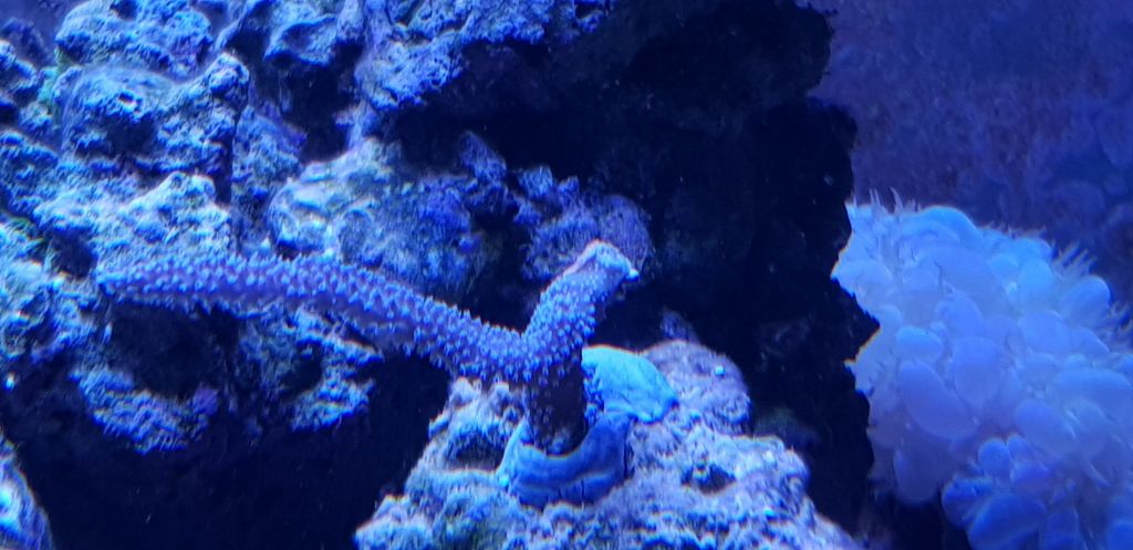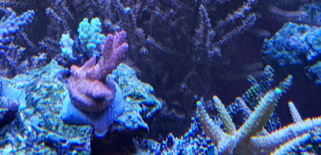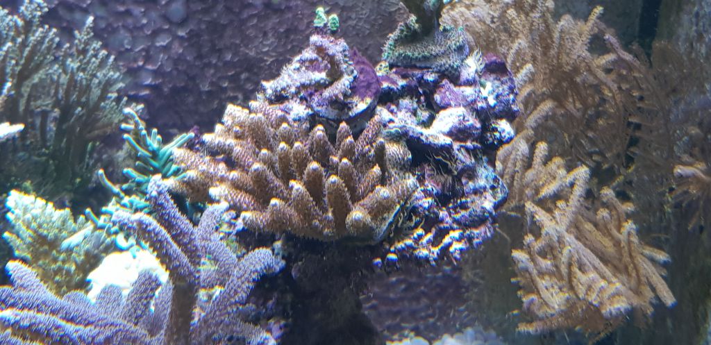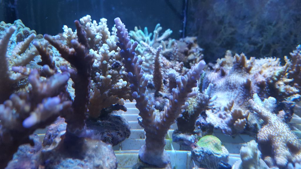 og de standart filtersvampe og sok bag til. Jeg fodrer minimalt mine to fisk, topper af med hanevand, og tilsætter intet til vandet ud over den smule fiskefoder, og jeg har fået en gammel stump sps , en sølvblå montipora digitata til af gro, men kun udover stenene ikke i grene eller opad.