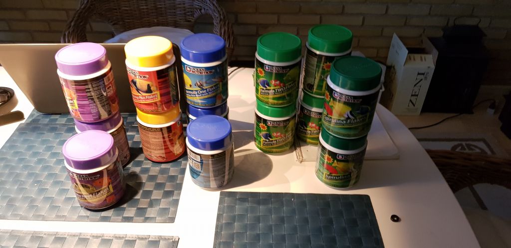 Når jeg fodrer, så bruger jeg altid halvt grøntfoder og halvt "kødfoder". Jeg er glad for deres formular 2 som er med hvidløg. Den bruger jeg som grundfoder - nogle gange fodrer jeg med spirulina for variationens skyld, men holder lidt igen pga min mistanke om at det kan fremme algevækst (spirulina og jern). Det blander jeg skiftevis med foder med Brine shrimp eller en af de andre "kød typer". Jeg tror at variationen er vigtig, derfor skiftes sammensætningen fra dag til dag.