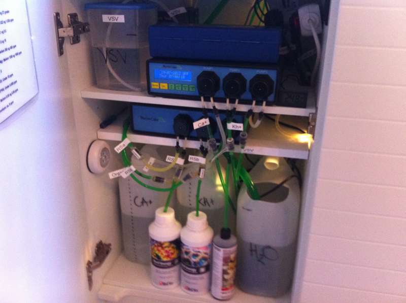 Jeg har vedhæftet et billed af mit nye doseringseventyr - nu må vi se hvordan det går. CA - MG og VSV kommer direkte i sumpen - Red Sea A + B samt Organotrace bliver doseret til den venstre Red sea max retur pumpe der originalt sidder i akvariet - fordelen er at den blæser det ud i en forholdvis tynd stråle ud foran min Vortech som så forhåbentligt blander det hele meget godt.