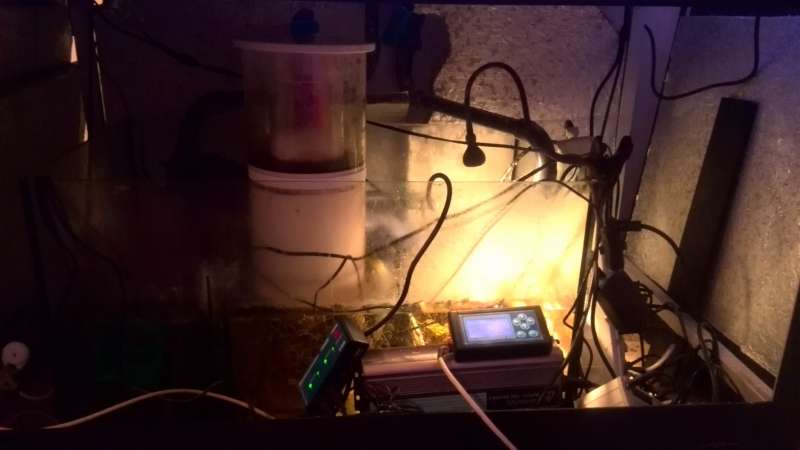 I Den grå kasse er der en Siemens logo som bruges til tænd/sluk af min hjemmebygget uas. Tænd/sluk sump lys. Styring af en hjemmebygget ATO vand standen måles med en ultralydsfølet. En blæser når fugtigheden eller temp i skabet bliver for høj.