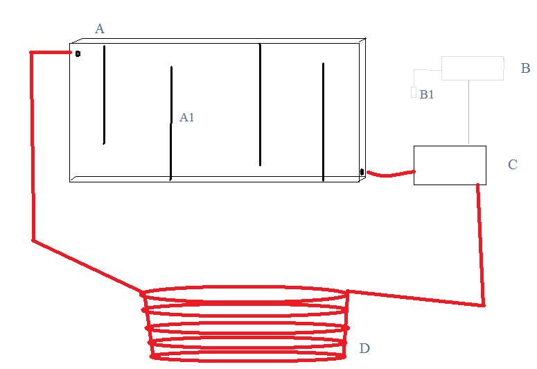pumpe (C), akvarie cirkulations pumpe tilsluttet relæ (B)
