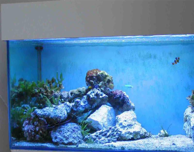 Det har kørt et par uger med vand og lidt kalkblokke. Idag har jeg fået to eramitkrebs, lidt små snegle og 5kg levende sten i. Jeg ved godt, at der kunne være meget mere levende sten i men det kører på buget