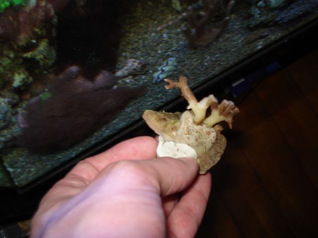 når man fragmenterer en syg koral er det MEGET vigtigt at man fragmenterer den et stykke over der hvor den er blevet hvid, samt at man bruger handsker til at håndtere fragmenterne. Og når man så har monteret dem, ikke at presse for hårdt på selve korallen.