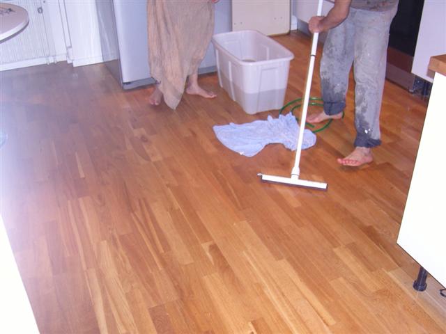 returpumpe på 5.500 L blev sat til en slange og så afsted med vandet til det nye akv. 20 min. så var den tom og flyttet så vi kunne hive gulvet op. Vi tager oven ud, opvaskemaskine og der var ikke kommet vand ind under der, det var der ikke kommet vand under køkken skalbe,oven osv. Vandet røg over mod den anden side af køkknet. Vi tog halvdelen af gulvet op endtil der ikke var mere vand at se under bræderne. En afugter skaffed vi og den køre så på fulde drøn