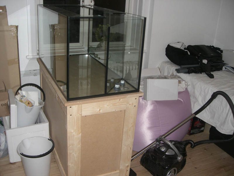 Akvariet blev leveret incl. en sump på 70 x 40 x 40 med en vandstand på ca. 25 cm. Sumpen er inddelt i 3 rum.