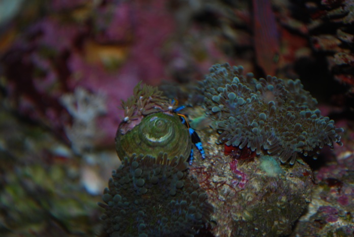 Jeg fik desuden en ny eremit med en koral på ryggen. Det synes mine to gamle eremitter ikke var sjovt så de hev to af benene af den og rev korallen af den. Nu har jeg sat den på stenen med noget putty. Den ser ud til at trives.
