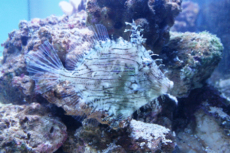 Den store fisk på billedet er en filfisk (Chaetodermis penicilligera) og den lille gylte ligner en seksstribet gylte (Pseudocheilinus hexataenia)...