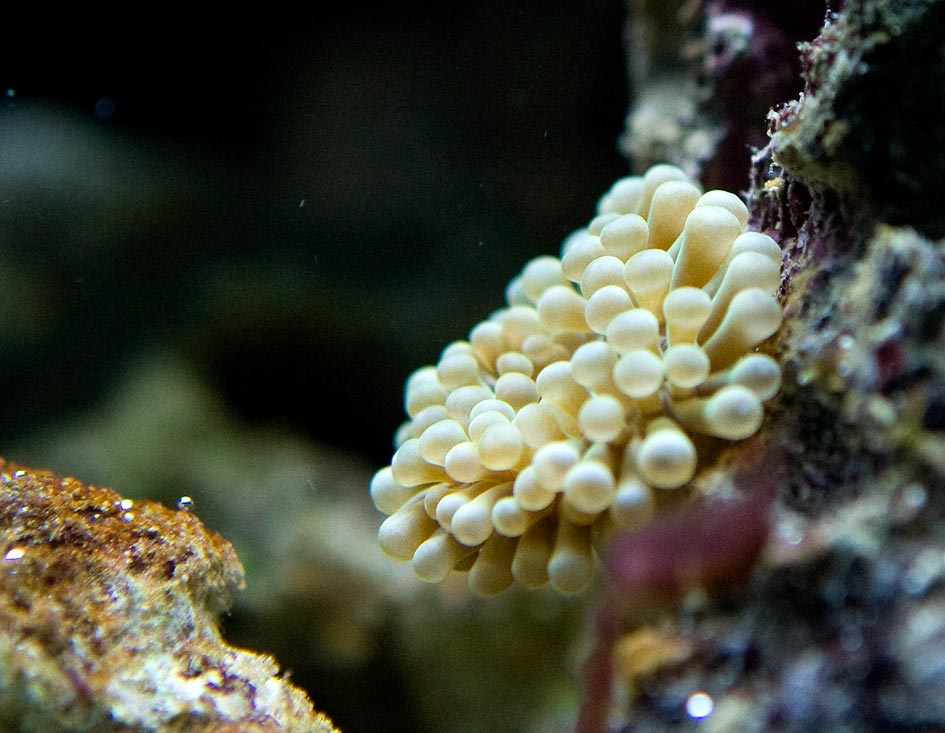 Du kan fjerne den let med Joes Juice. Koster ca 100 kr. så har du til en anden gang også. Og det skader ingen ting andet end anemone og glas rose. Ingen cirkulation ryst flasken sug det op i den medfølgende sprøjet , og sprøjt en lille smule juice i midten på den og den er færdig. Tænd cirkulation igen efter 2-3 min. Så er det prblem løst.