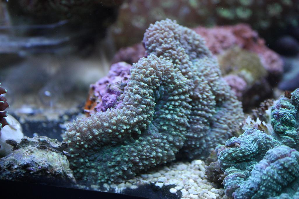 Mærkelige farver på billederne, Korallen på billede 2 står her nu. Selvlysende grøn og med helt pink tentakler og spidsen på dem er lilla. Rigtig flot, ganske som resten der var der