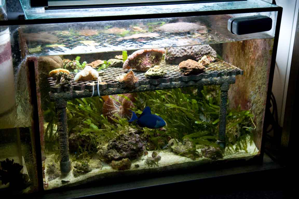 Akvariet er på 550L og er fra 2004, det blev flyttet 2 gange det først år jeg havde det. I de sidste 4 år har det været indbygget i væggen i vores køkkenalrum.