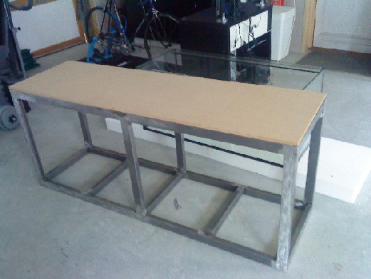 bordet har jeg lavet ud af 50x30x1,5mm stål rør og måler 170x70x50 og er beklædt med 16mm spån-plade.