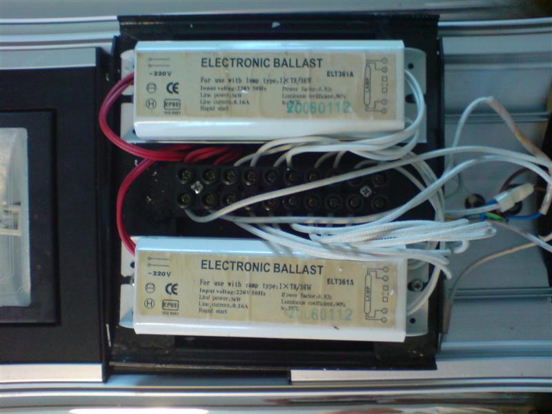 Jeg har en gammel Silver sun 150 (2X150W HQI og 2X40W blå rør) hvor det ene T8 rør ikke tænder og jeg har prøvet at bytte rundt på rørene så jeg ved at begge T8 rør virker. Derfor gættede jeg på at det måtte være en elektronisk dims (evt glimtænderen) som det var galt med og skruede den fra hinanden for at finde glimtænderene. De findes åbenbart ikke (har dog ikke haft den midterste kasse åben - kun de to yderste) , men jeg fandt et par elektroniske ballaster til T8 rørene (se vedhæftede billeder).