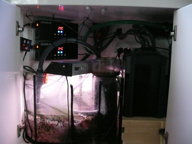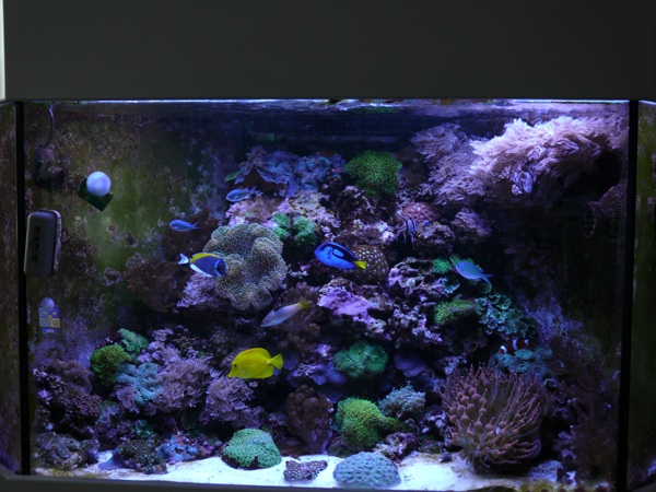 Jeg startede op med et akvarie på 128 liter med de to klovnfisk og kardinalfisken. Efter et par år synes jeg at det blev for lille og kedeligt ,og så købte jeg dette hjørneakvarie.