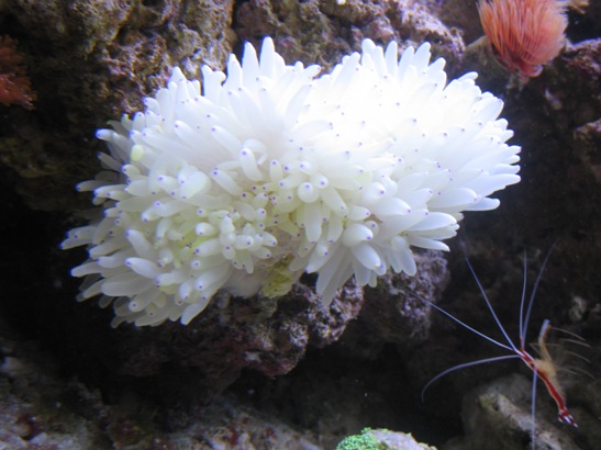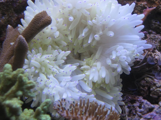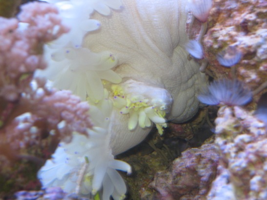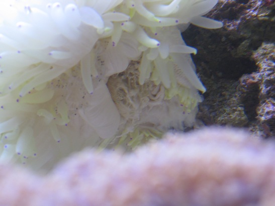 Jeg købte en anemone i lørdags til Klovnefiskens fødselsdag. Jeg satte den et sted, men det gad den ikke og gik lidt omkring (fint nok) Der har den så siddet indtil idag, hvor jeg lagde mærke til at den begyndte at blæse sin fod op i håb om at blive blæst væk til et andet sted (tænker jeg)