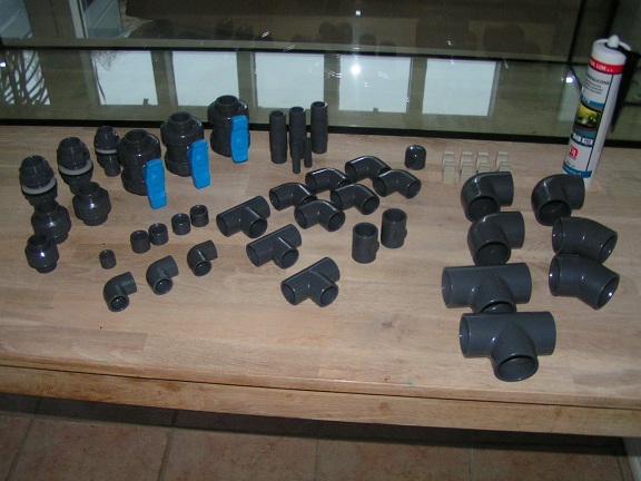 Men har fået lavet huller til gennemføringer og monteret gennemføringerne i akvariet så nu kan jeg begynde at lime pvc.