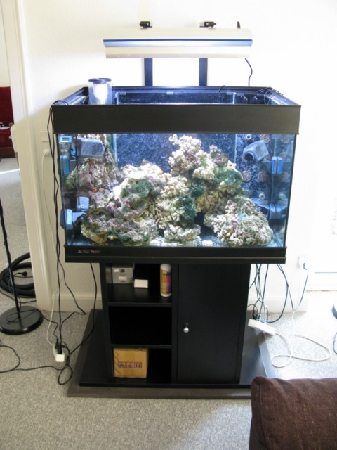 Jeg købte akvariet brugt d. 8./2. 2010 inklusiv original Aqua Medic Turbofloter Percula som bliver drevet af en OceanRunner 2500 med nålehjul. (vistnok en T-flotor 1000 modificeret af AM til at passe i sumpen). Derudover en AM 1000 ltr/t retur og to AM 1000ltr/t cirkulationspumper. Til sidst fik jeg også en AM Oceanlight 150W HQI med.