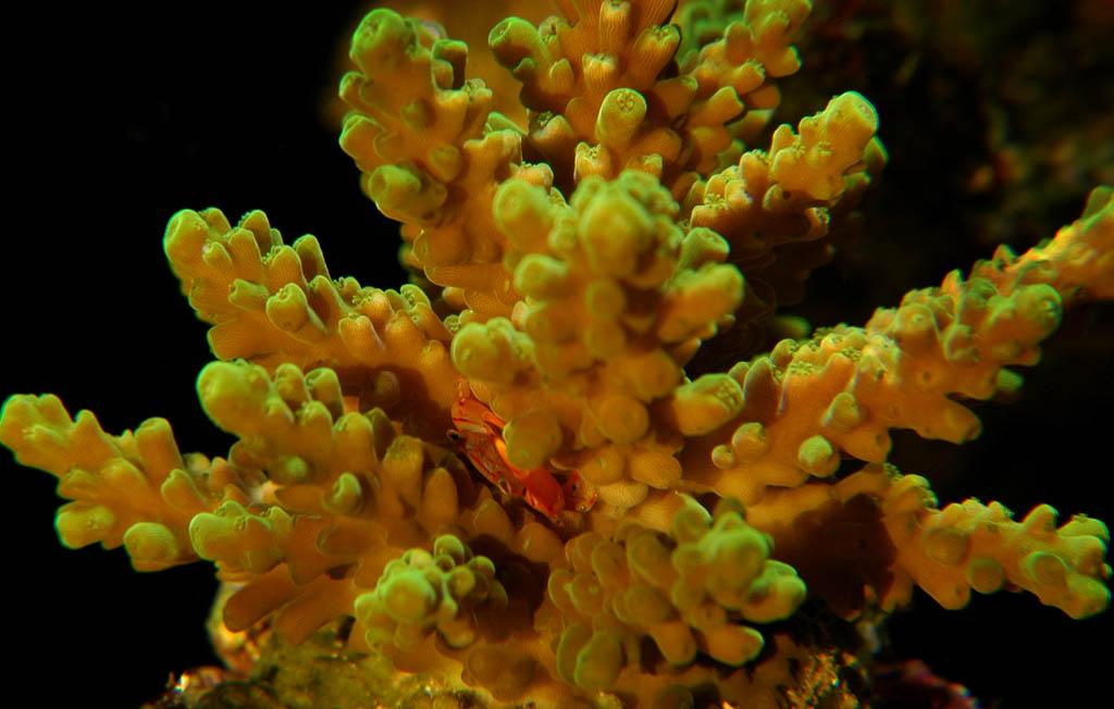 Navn ukendt: En koral krabbe som nogle gange kommer med Acropora eller Stylopora koraler. Denne type krabber menes ikke at gøre nogen skade og nogle mener endda at de kan hjælpe med at beskytte koralen.