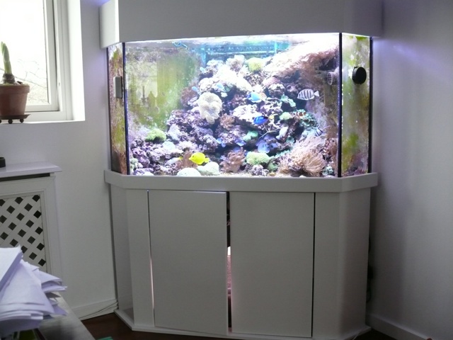 Jeg startede op med et akvarie på 128 liter med de to klovnfisk og kardinalfisken. Efter et par år synes jeg at det blev for lille og kedeligt ,og så købte jeg dette hjørneakvarie.