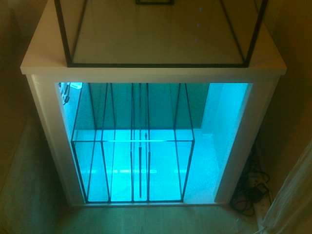 Det er et 50*50*50 med 3 sider optisk glas. Samt en sump på 45*45*45 med en 20L ferskvandstank.