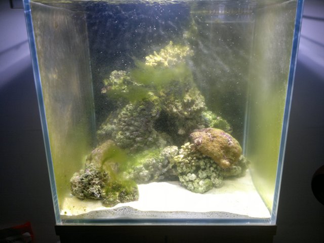 Nu har akvariet som sagt vaeret koorende 1 uge og nogle af korallerne har faaet en fin hinde af brun alger, men ikke saa meget som jeg havde frygtet.