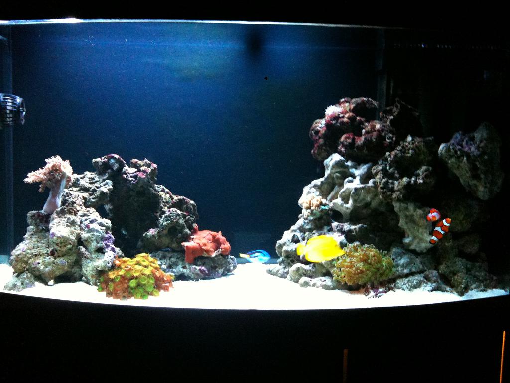 Info: Akvaret har kørt ca. halvanden måned og er på 180l, med 4x24w t5, overløb i højre hjørne og vortech mp10 som cirkulation.