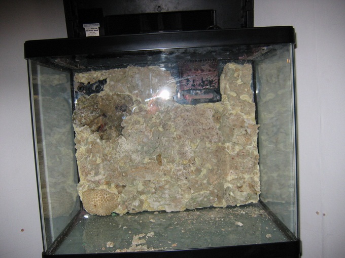 jeg har lavet mit ved at tage en plexi plade og smørre masser af PU skum på også sprøjne det med grov akvariesand. Du skal sørge for at de er helt tøre, ellers klister det ikke fast. Alt det med sten og koralgrus har jeg aldrig haft held med. kan ikke få det til at sidde fast.