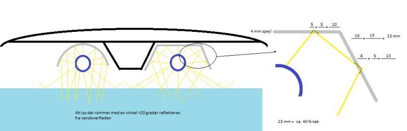 Selve reflektoren der sidder i lampen bør være lavet af mylar eller lign. som peder er inde på. Fordelen er at lyset ikke skal rejse gennem glasset flere gange for at nå vandoverfladen.
