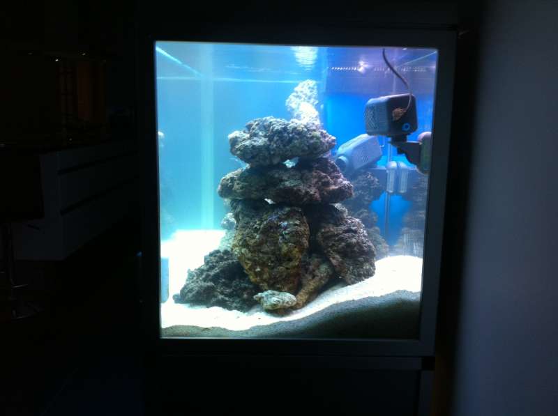 Det ser bare rigtigt godt ud Morten, men er virkelig ked af at skulle ionformere dig om du endnu engang skal lave det om. Levende sten på sand er TOTALT NO GO. Div fisk, dyr kan grave sig ned under stenene i sandet og demed vælte din opsætning. Stenene skal hvile på bunden og så skal der sand i til sidst.