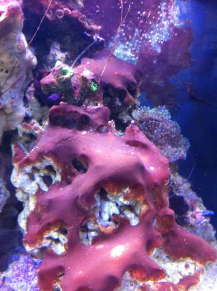 Det er et nyt akvarie, på 150 l + 80 l sump, startet op med døde "levende sten" og "levende" sand. Efter ca. en måned kom jeg ca. 3-4 kg levende indkørte sten i (mit lille 30 liters blev lukket ned) der kom også lidt sand 2 klovnfisk og lidt forskelligt snegle krebs osv. i lidt senere kom der CUC i.