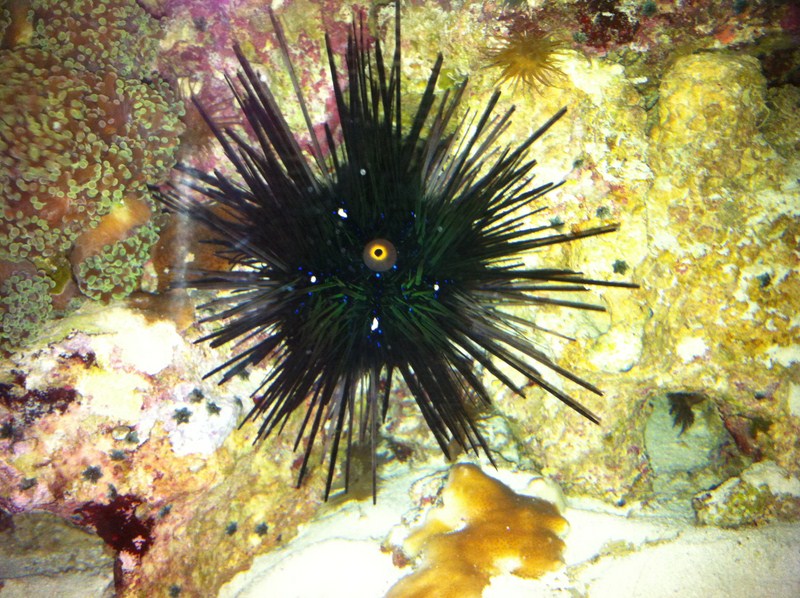 Den type søpindsvin mener jeg ikke er kendtfor andet end at græsse alger, og vælte koraller.