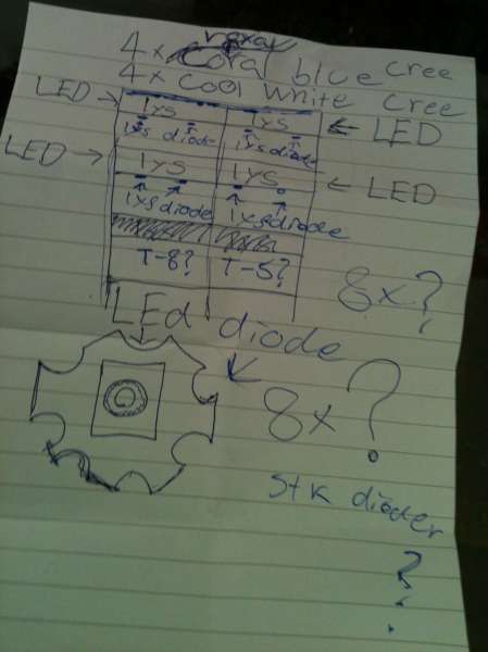 men hvis det udelukkende er fisk gør det ikke så meget hvor meget lys du bruger, hvis de kommer højt nok op tror jeg godt at 2 dioder uden reflektor vil kunne dække et lille akvarie. det bliver jo så nok svært at få højde på over en reol.