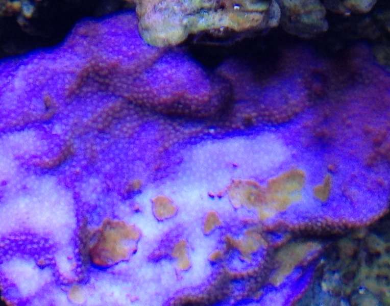 På et par af mine monti er der nogle små pletter af en eller anden grøn-brun belægning. Troede først det var fiske "proteiner", men min supermand står næsten helt lodret, så det er det nok ikke. Synes heller ikke det ligner noget der kunne henføres til snegle, Har uden held forsøgt at børste forsigtigt med konens tandbørste. Nogen der ved hvad det er? Hvorfor er det kommet? Og hvordan slipper jeg af med det? På min ene Tridacna sidder der 2 mærkelige ting. Dene ene ligner nærmest en lille brun Discosoma, hvis det ikke lige var fordi den har hul i midten. Den anden ligner nærmest en rørorm, men det tror jeg bestemt ikke det er. Hvis det er, er den i al fald aldrig ude af røret. Må dog givetvis være noget levende, for jeg tror den er vokset betydeligt. Hvad er det for nogle monstre? Noget jeg bør fjerne? Så har jeg også sådan en lille fætter her, som måske også godt kunne ligne en lille Discosoma. Det tror jeg bare ikke det er med de farver den har. Nogen der ved hvad det er? Min hystrix har på den ene af spidserne fået et mærkelig udvækst, som vokser relativt hurtigt. Ligner nærmest 2 hænder med halvtreds fingre som er foldet ind i hindanden. Er den vandskabt? (aarghh, den var vandet). WTF er det? Skal jeg klippe det af? På et par af de sten som korallerne er limet på, er der nogle små pinde, vel ca. 6-7 mm lange og 1 mm i diameter, som stikker op igennem kalkalgerne. Synes ikke de ligner de billeder jeg kan finde af hydroider. De ser da heller ikke ud til at bevæge sig på nogen måde. Hvad er det? Skadeligt? Og for 10 minutter siden har jeg lige spottet denne her store blå hvide fætter blandt en flok Zebrasoma flavescens i et akvarium jeg ikke engang vidste jeg havde: PFT