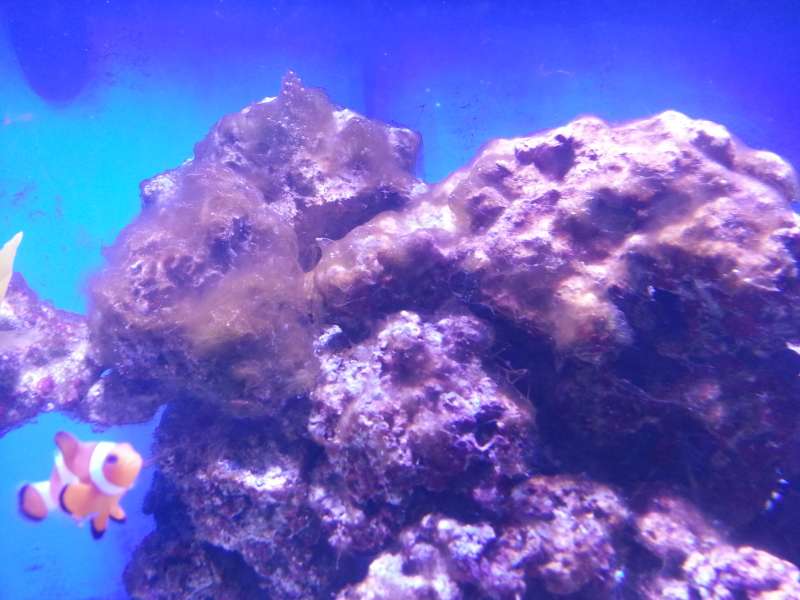 Algerne ligger tæt hen over nogle af stenene, men i det øjeblik at jeg slukker for cirkulations pumperne så rejser det sig som et spindelsvæv og svæver i vandet, som det ses på billederne! ca. 15- 20 min efter er vandet HELT klart igen!