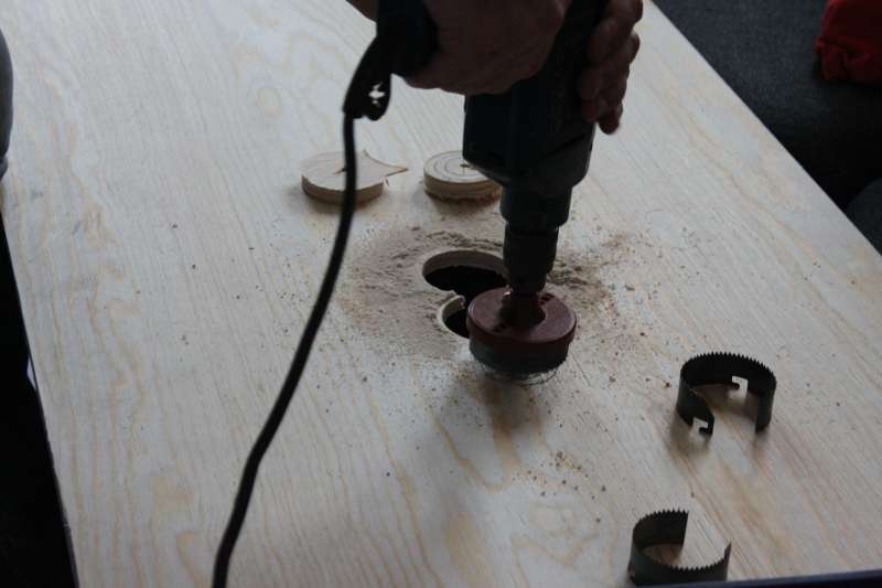 Så var Carsten forbi med træplader og fik limet fittings i overløbskassen.