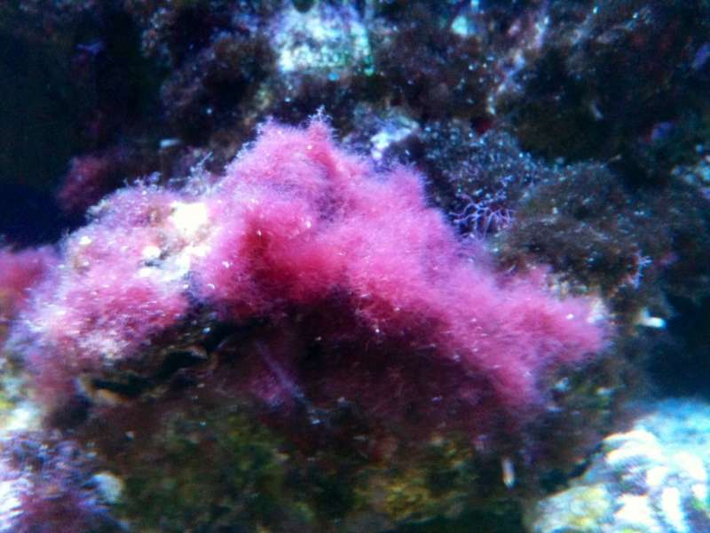 alger er ikke vatagtige mere og bliver mere brunlige, og så dukker der hvide (røde pletter = kalkalger op hist og pist) = algerne forsvinder. Lige nu ligger de som et 2-3 mmm lag oven på de angrebne sten. Andre steder er akvariet helt frit for dem - måakw pga cirkulationen!!!