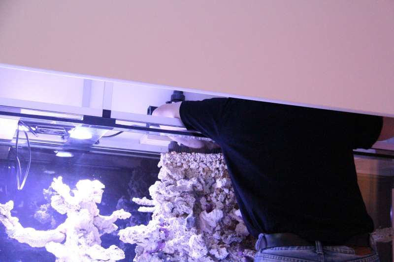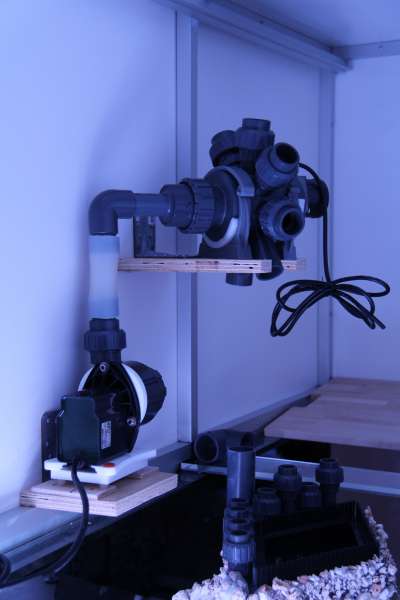Heldigvis kan rørføringne jo skjules i vores store "lyskasse". Carsten havde heldigvis gode ideer til hvordan den kunne sidde på skrå over akvariet. Der skulle jo også tages hensyn til lampeplaceringen.