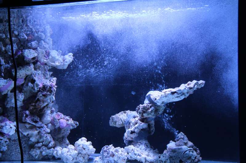 Jo.. der er lavet bobblefælde i sumpen. Returen fra akvariet går ned yderest til højre hvor skummeren står. Efterfølgende er der en lille glas kant over mod venstre side, hvor vandet løber hen over og ned i en kurv der er dækket med filtervat. Det skulle gerne fange alle bobblerne fra returvandet fra akvariet og fra skummeren.