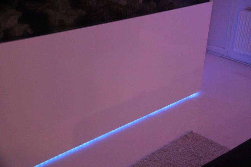Lyset kan styres med en fjernbetjening i farver og styrke. LED lyset rundt om akvariet er med til at gøre udtrykket mere let.