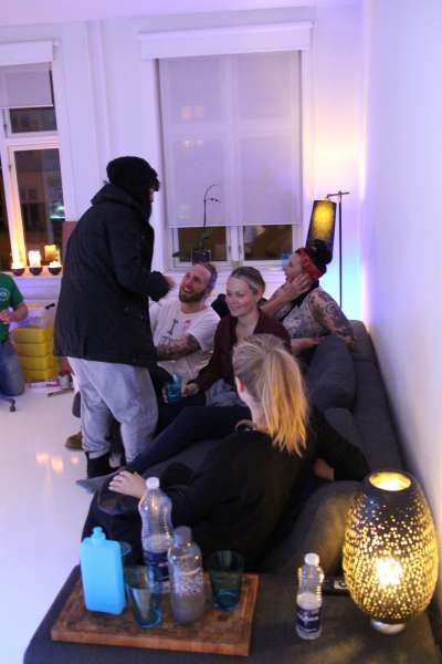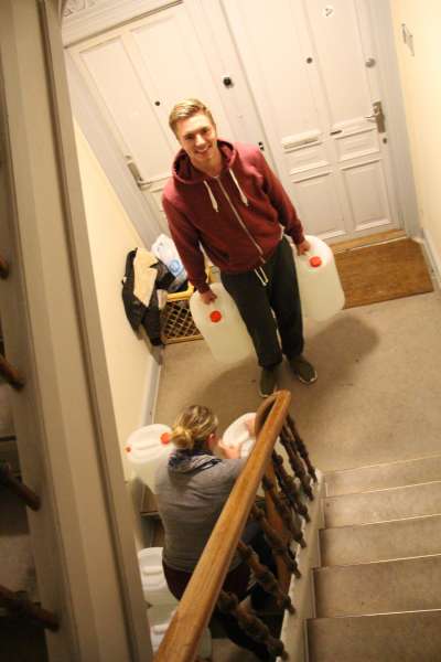 Vi havde inviteret nogle gode venner der var super cool til at hjælpe med at slæde vandet på 4 sal.. De var 8 styk og effektive så det tog kun ca 15 min! Derefter pizza party!