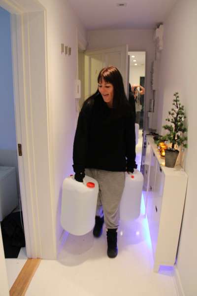 Havde laget til rikeligt med osmosevand nede i kjellern,og fylte nøyaktigt vand opp til 20 liters merker op store saltspand,og bar de to og to ud fra kelderen,ud af huset,rundt huset og opp trapper og ind i etagen over hvor baljen står.