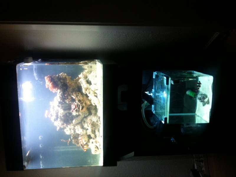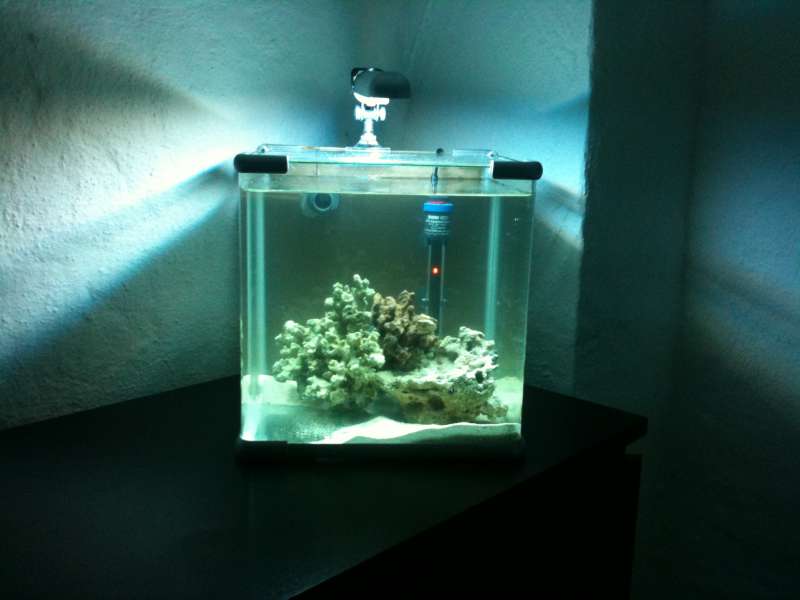 Den kører derudaf. Jeg startede et Red Sea Max 130d op, så der er kun en lille sten og to fløjlsklovne i nanoakvariet. De bliver dog solgt i morgen. Om der kommer noget nyt i det lille akvarie eller om det skal agere sump ved jeg ikke endnu.