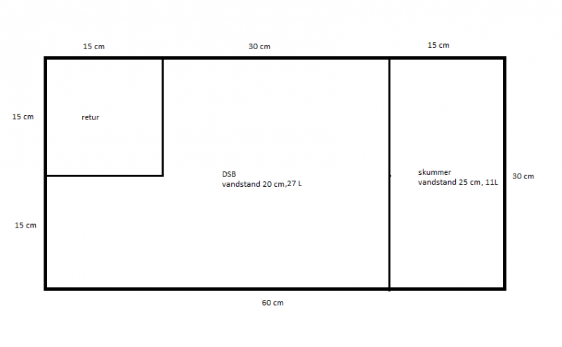 Jeg er i tvivl om hvordan jeg udnytter de få liter bedst og hvilke rum det skal indeholde indtil videre er jeg kommet frem til ferskvandskammer, skummerrum, rum til DSB/refugium og retur.
