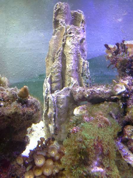 pH svinger mellem 8.3-8,4. Mg ca 1250 ca 400 og alk 8. Stensætningen er meget åben og der er god vandbevægelse omkring stenene. Jeg har en baggrund på 130x50x10, den bliver "støvsuget" ved vandskift, men den ryger på loftet nu. Jeg har ca 150 kg levende sten i sumpen, de kommer lige op og får en hurtig skylning i rent saltvand