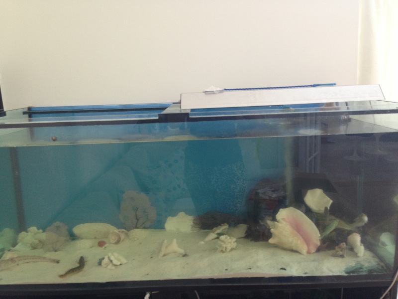 Indretning: Har for flere år siden taget ialt 20 kg sand med fra Thailand og Karibien og bruger dette som utrolig flot bundlag. Det samme med stor muslinger og koralstykker fra diverse rejser. Herudover har jeg lagt nogle sten begroet med grøn tang og blæretang i akvariet. Vandet har jeg fragtet hjem i bil fra kattegat og det norlige øresund i dunke.