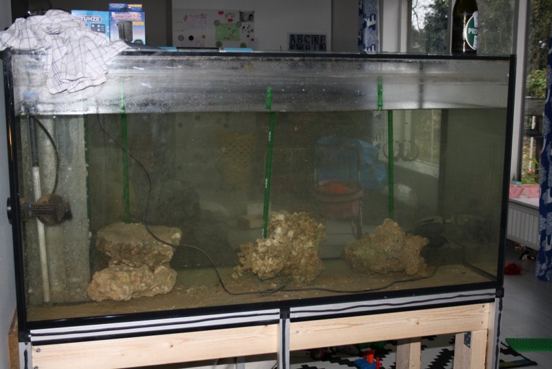 så kom akvariet op. det er savet 20cm mindre. nu er bordet kun 70cm højt og vakler helt vildt bare når min mindste rolling står og klapper på siden..Derfo har jeg bygget det ekstra træbord under porsaen. Nu står akvariet urokkeligt og også i vatter, selvom det er svært at se på de billeder her:-)