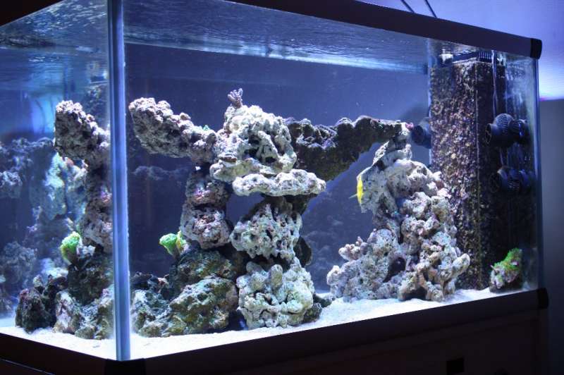 Efter at det meste var dødt, prøvede jeg at lade akvariet passe sig selv. Men i 3½ mdr blev der ved med at være, et meget fedtet alge/bakterie lag på en 1½ cm tykkelse, som kom igen lige så hurtigt som jeg kunne børste det af stensætningen. Da jeg ikke gad at kigge på det mere, valgte jeg så at tømme baljen og starte op fra bunden igen. Det har nu stået i 2 mdr. og kørt ind, og i søndags var jeg forbi joekill og købe lidt fragmenter og satte i tanken, og de står flot.