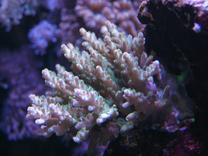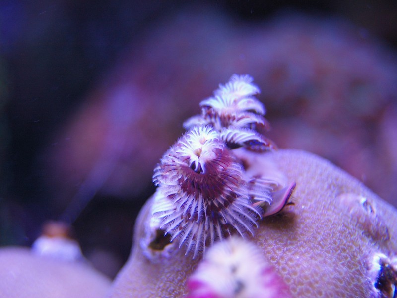 Som dekoration er naturligvis også et mindre antal levende sten, som jeg har beholdt. Mest fordi der lever koraller på. Da jeg startede akvariet op, lagde jeg 50 % af mine levende sten, fra det tidligere akvarie, ned blandt keramik søjlerne for at seede akvariet med min eksisterende biologi, men disse er efterhånden taget op alle sammen.