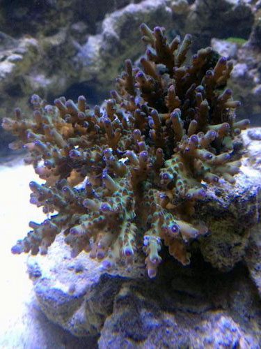 1 x Acropora tricoler. faven bliver lilla med grøn polypper forhåbentlig. 1 x anden jeg ikke husker navnet på, men den er blå og ser ud til der kommer rød/brun polypper på virkelig smuk. 1 x XL Spyflue tror jeg Carsten kaldt den. Billeder kommer i sener skal lige have nogen ordenlige af dem.