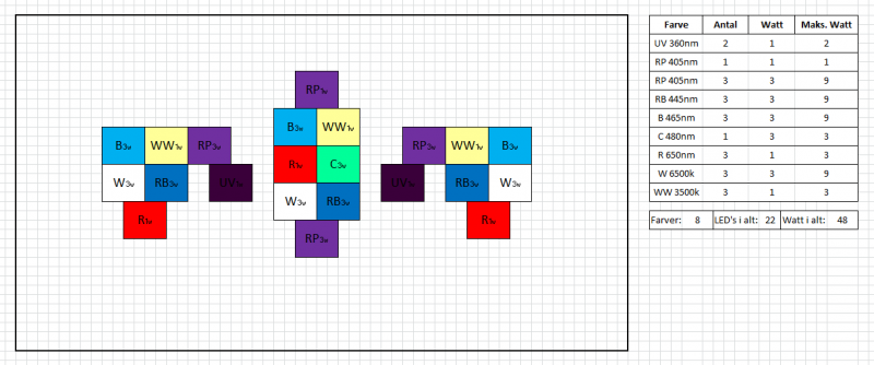 Og så 1 X 405nm 1w og 2 X UV 360-380nm 1w på en ekstra kanal, som jeg vil eksperimentere lidt med :-)